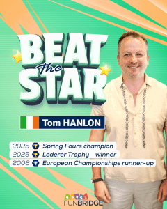 The competition starts on 26 February (this Thursday) and will run for 3 days. You’ll play 12 boards against Tom, with IMPs scoring. You will need a Funbridge premium subscription to play but the code CBAI2026 is still active, and will give you two months’ free as a premium subscriber. (You will be charged after the two months expires.) To register for the competition, just click on this link. We hope to see plenty of people take Tom on, and that at least some will “beat the star”.