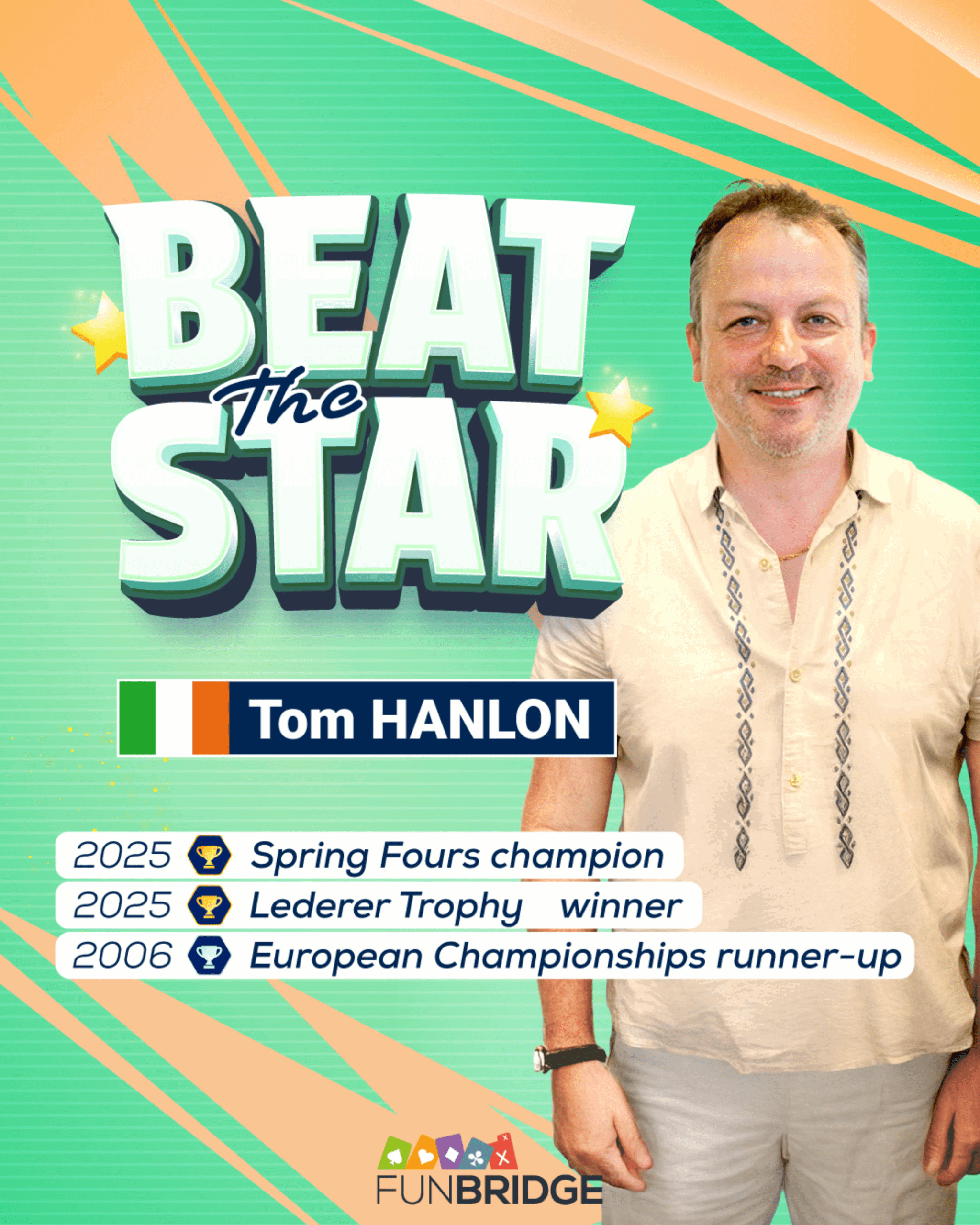 The competition starts on 26 February (this Thursday) and will run for 3 days. You’ll play 12 boards against Tom, with IMPs scoring. You will need a Funbridge premium subscription to play but the code CBAI2026 is still active, and will give you two months’ free as a premium subscriber. (You will be charged after the two months expires.) To register for the competition, just click on this link. We hope to see plenty of people take Tom on, and that at least some will “beat the star”.