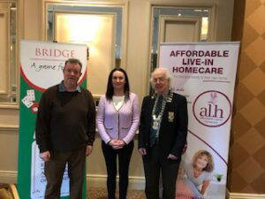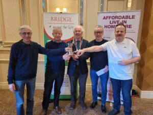The CBAI’s Holmes Wilson Trophy (National Open Teams Championship) competition was held over the weekend of 10/11 February in the Mount Wolseley Hotel in Tullow. An excellent turnout of more than 109 teams from all over the country represented the largest Irish bridge gathering since covid, and the feedback is that everyone enjoyed themselves. Our thanks to all who participated, and to our sponsors of this event AL Homecare, who were represented at the competition by Eileen Corbett, pictured below with CBAI President Gordon Lessells and Chief Executive Dermot O’Brien.