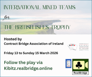Ten teams, representing all five home nations, will compete for the British Isles Trophy over the weekend of 14-16 March, online on RealBridge. This is the Camrose-style Mixed Teams Championship devised by Mike Ash, and hosted last season by the Scottish Bridge Union. This year the Contract Bridge Association of Ireland will host, with Fearghal O’Boyle as Chief Tournament Director.