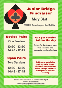 Peter Pigot and the Junior Committee will hold another special fundraiser for Irish junior bridge in Templeogue on Sunday 31 May. There will be two sessions of bridge, one at 10:30, the second at 14:45, and players can enter one (€25) or both (€40) sessions. There will be overall and separate sessional prizes, and all are welcome. There will also be tea/coffee, snacks, a raffle, and more. Please support this fundraiser and help aspiring Irish juniors by way of coaching and the opportunity to play at developmental tournaments in the UK, Europe, and the US. Playing against top players on a regular basis is THE BEST WAY to ensure the development of our junior squad, which currently contains some very promising players. Enter via the CBAI website.